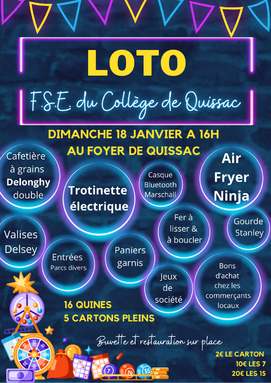 Nous organisons le loto du collège le dimanche 18 janvier 2026 à 16h au foyer de Quissac.